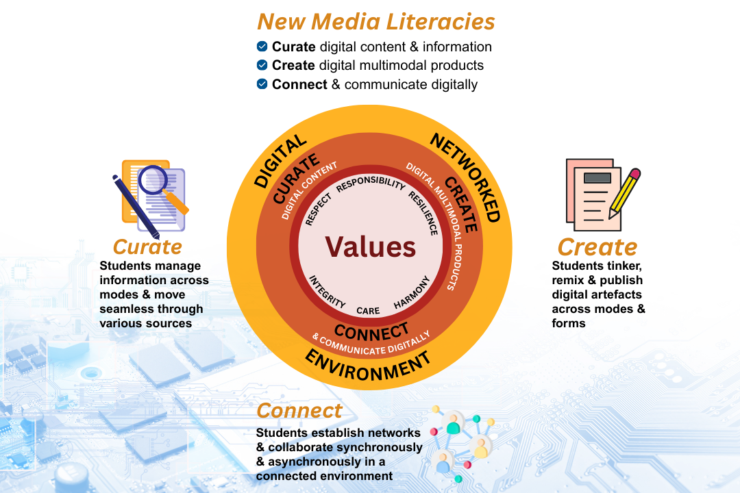 Our school’s ICT literacy programme is built on MOE’s standards of new media literacy and includes the skills, knowledge, attitudes and values (SKAV) that students should apply and demonstrate when harnessing ICT for learning and interacting. The new ICT baseline standards are: curating digital content; connecting and communicating digitally; and creating digital multimodal products.