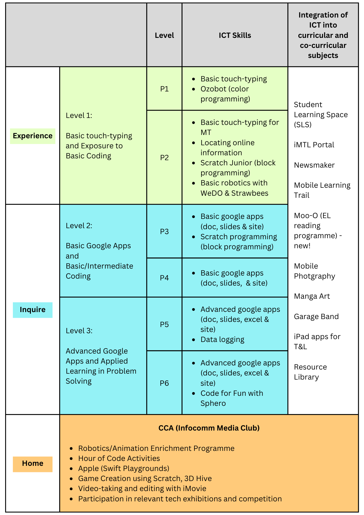 Our ICT programmes across P1 to P6 aims to equip every student with the fundamental ICT skills and literacy to be a future-ready individual. Through the introduction of computational thinking and the infusion of new media literacies into different disciplines, the programme sets out to achieve the following objectives, where students are able to: